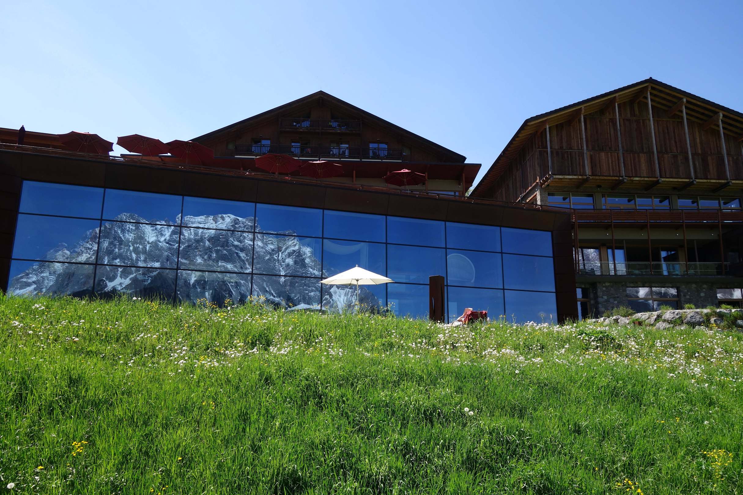 Die Zugspitze spiegelt sich von außen im Poolbereich