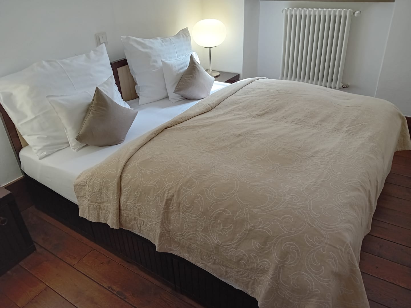 Doppelbett der Suite (das Fußende steht beinahe an der Wand an)