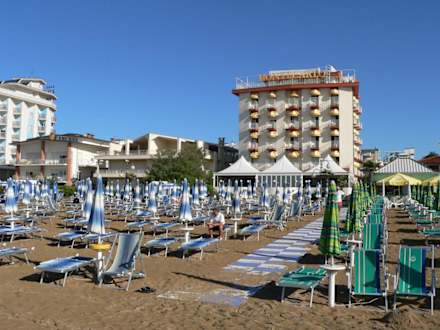 Ansicht des Hotels Montecarlo in Lido di Jesolo mit zugehörigem Strand