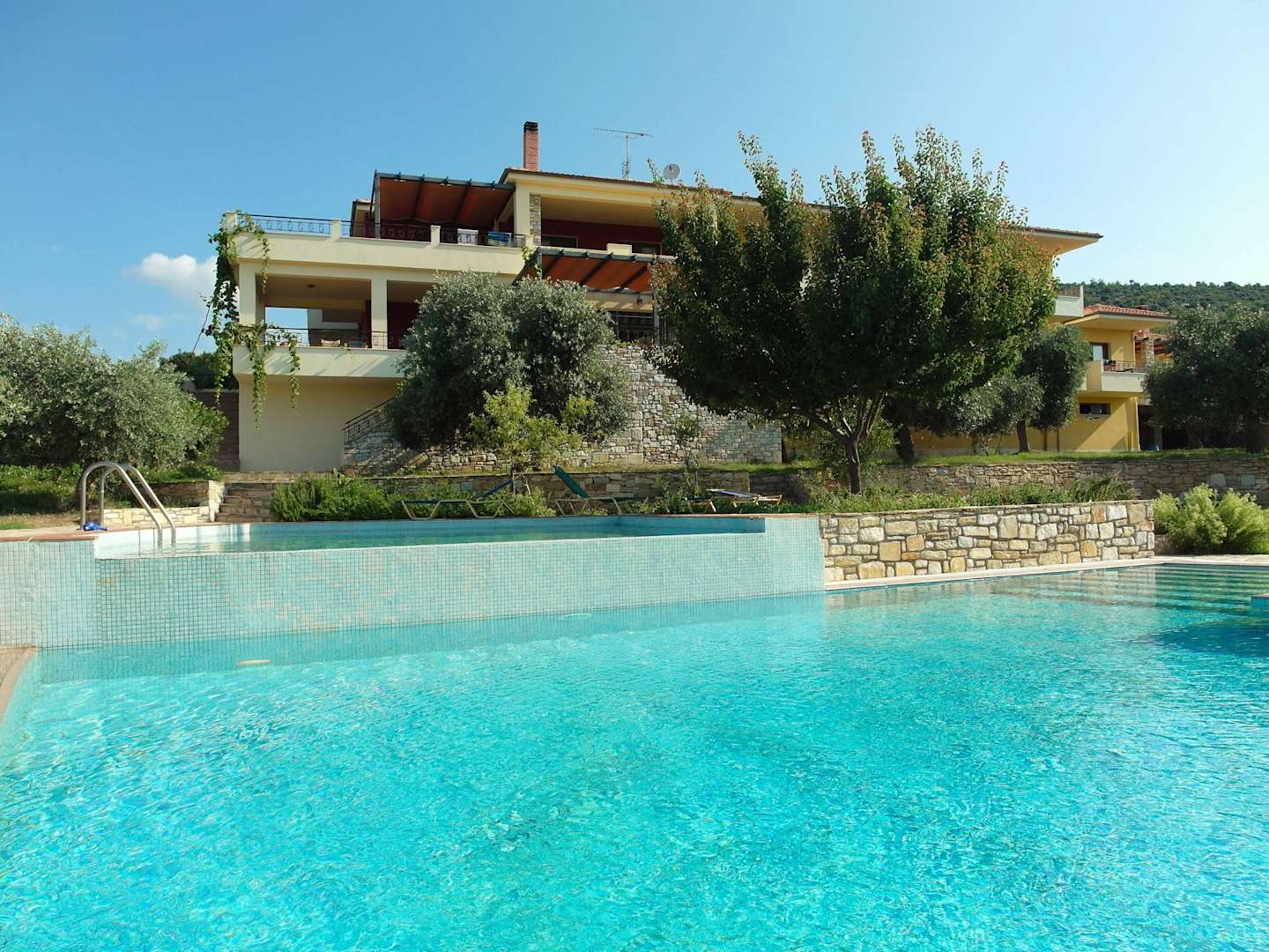 Blick vom Pool auf das Hotel