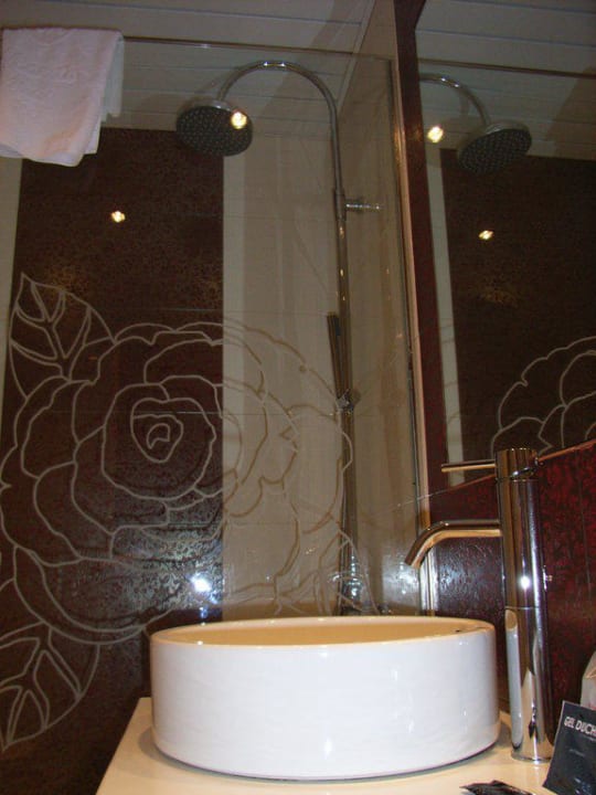 Im Vordergrund Waschbecken, im Hintergrund offene Dusche mit großer Duschbrause