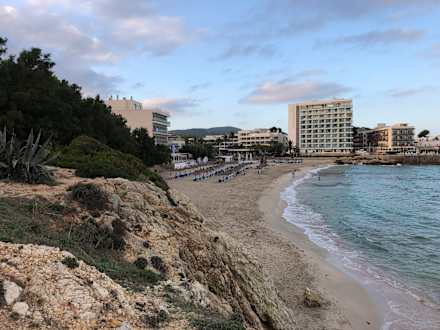 Blick von den nahegelegenen Felsen auf den Sandstrand