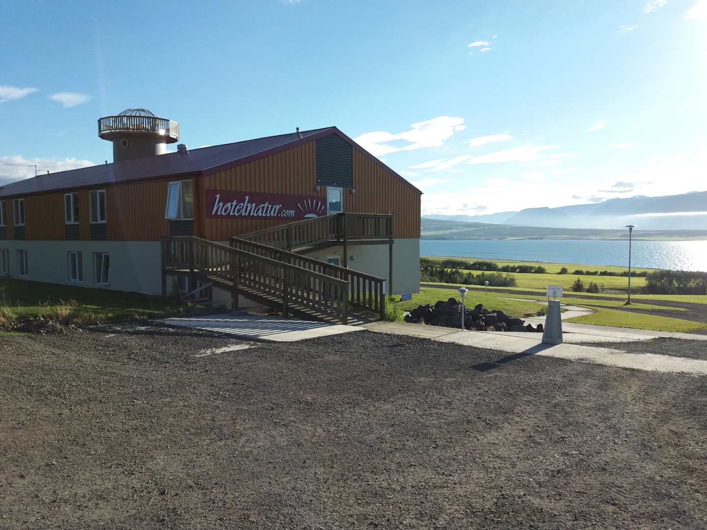 Blick vom Parkplatz zum Hotelgebäude