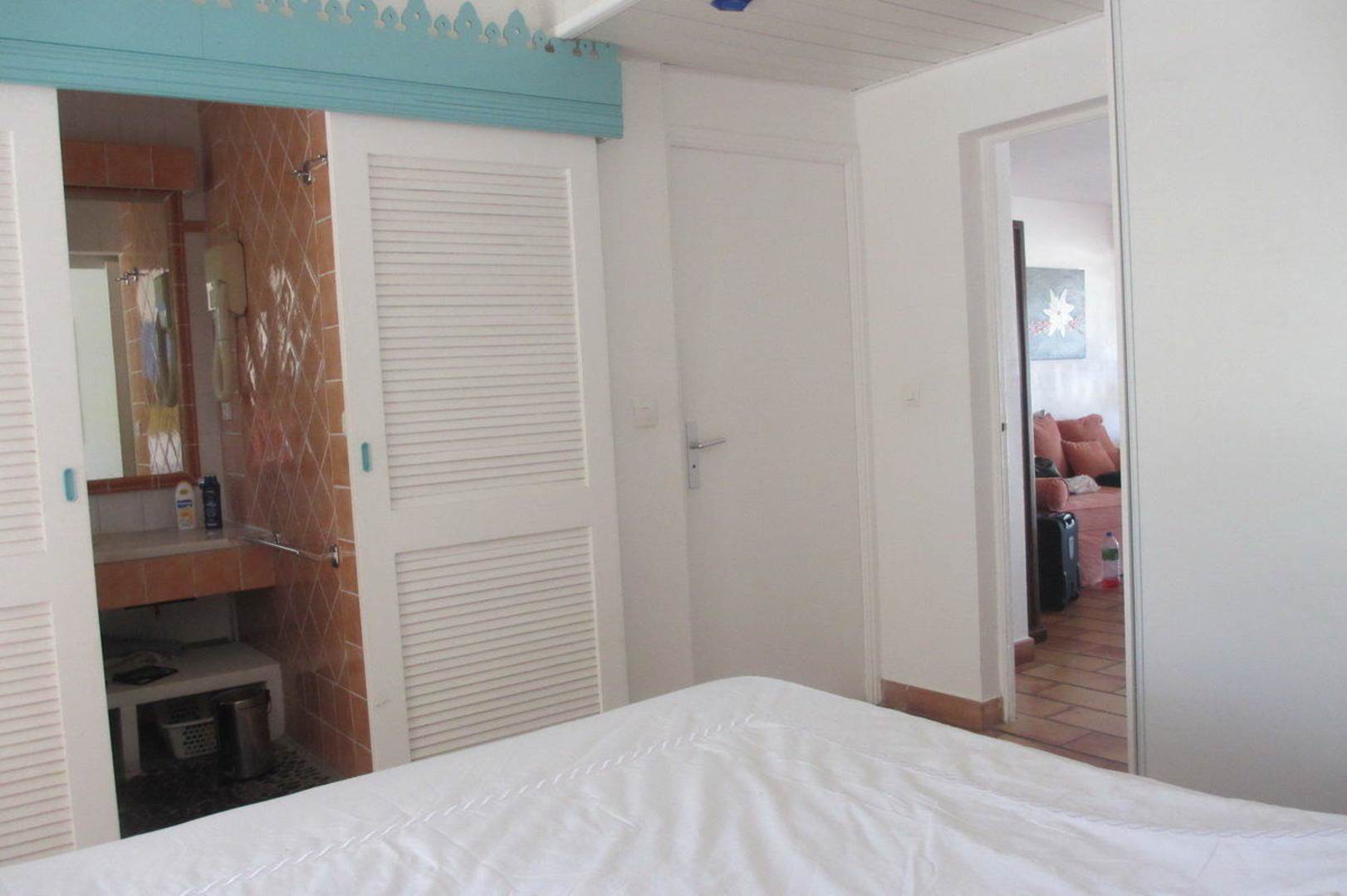 Schlafzimmer mit Sicht aufs Bad