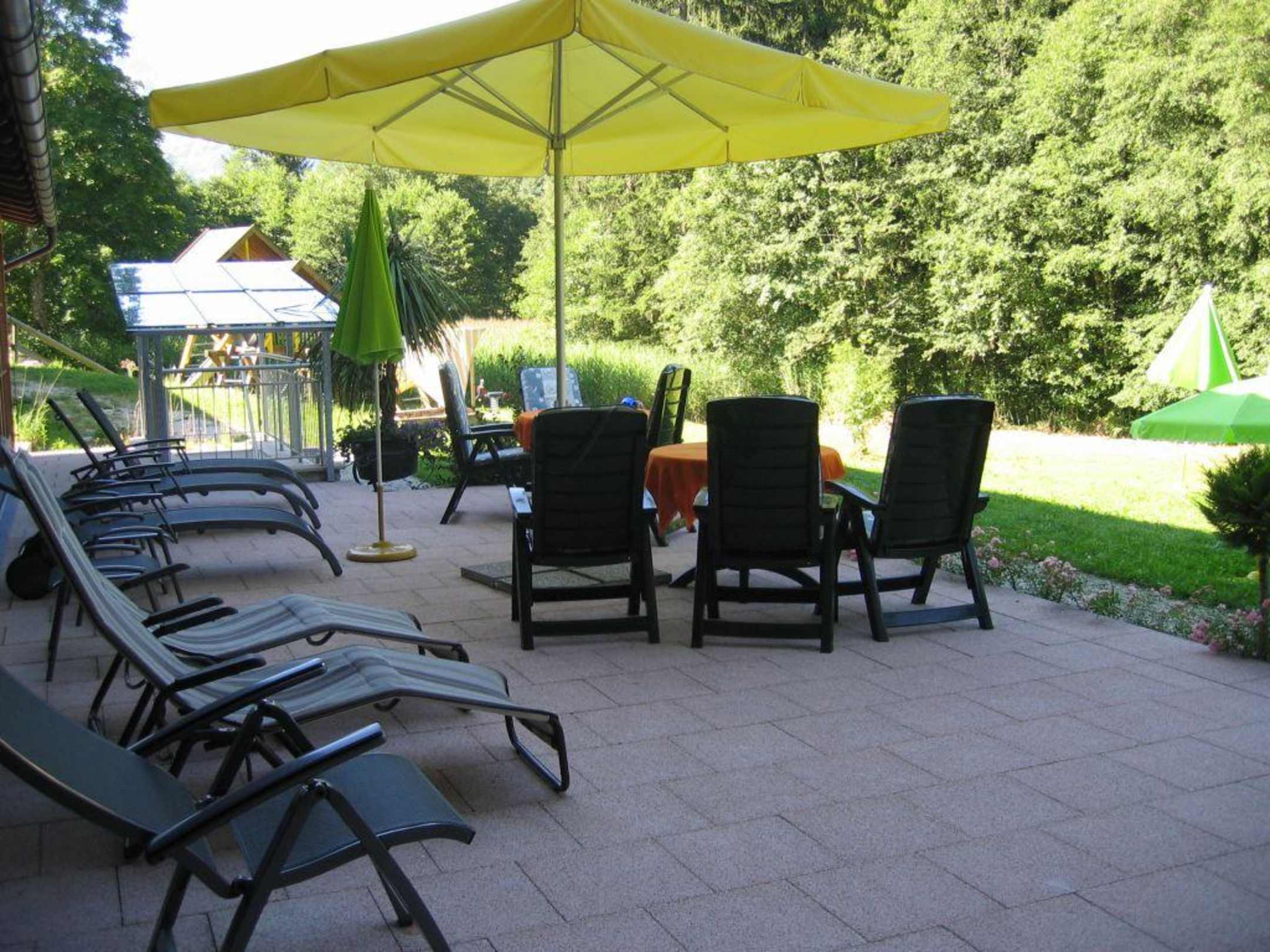 Sonnenterrasse mit Liegen und Spielgerüsten im Hintergrund