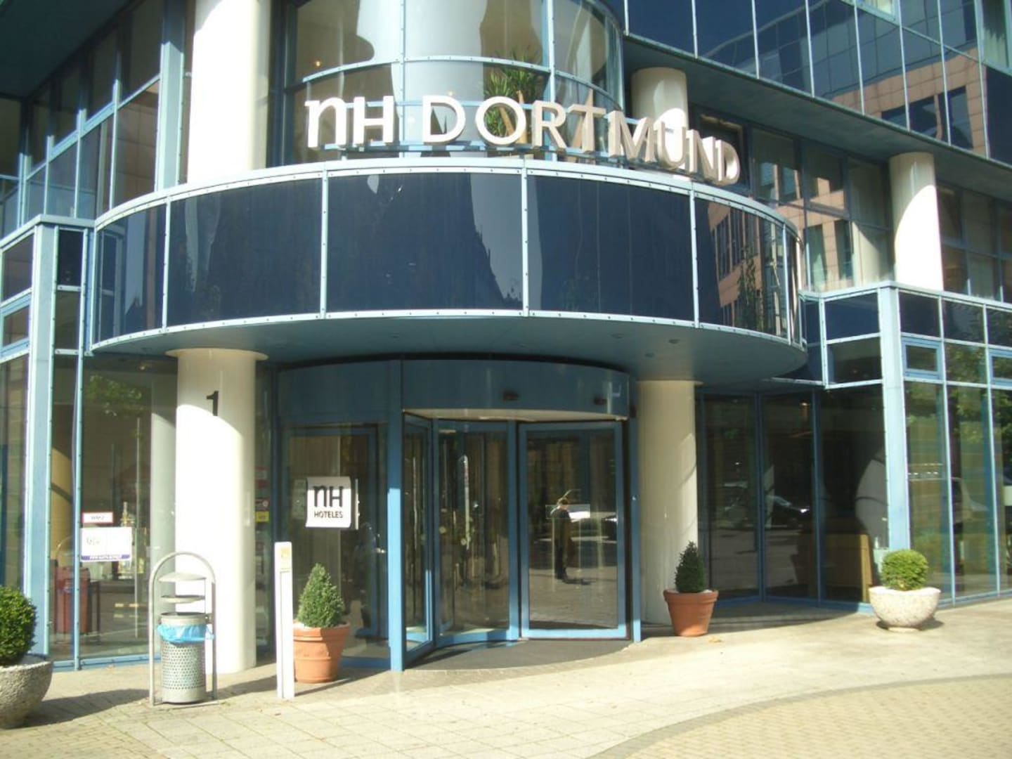 EingangEingang mit Drehtür. Drinnen rechts ist die Rezeption. Ganz rechts hinter der Glasfassade befindet sich der Speiseraum.