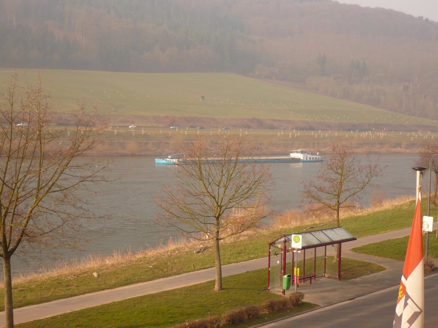Blick vom Balkon auf die Mosel und die vorbeifahrenden Schiffe