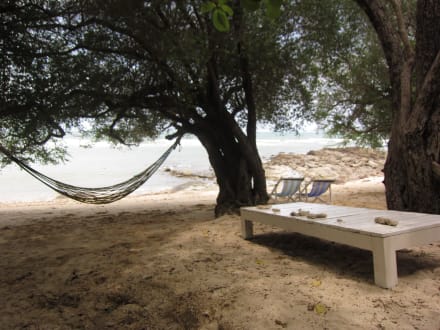 Schattiger Strand mit diversen Liegemöglichkeiten
