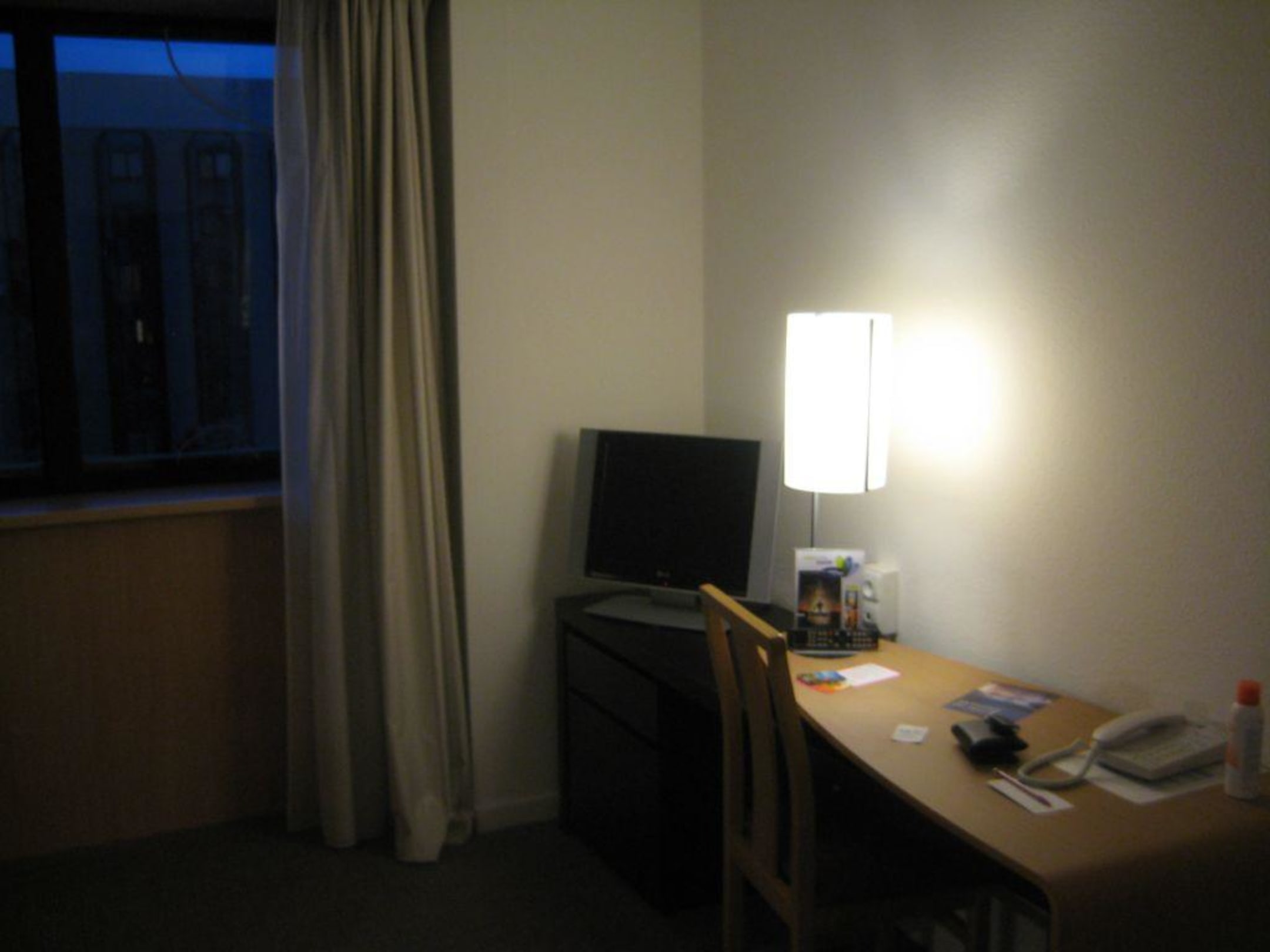 Aus der Sicht des Vorraums, das Hotelzimmer. Flat-TV, ein breiter Schreibtisch und das Fenster (nicht zu Öffnen, da Klimaanlagenvorrichtung)