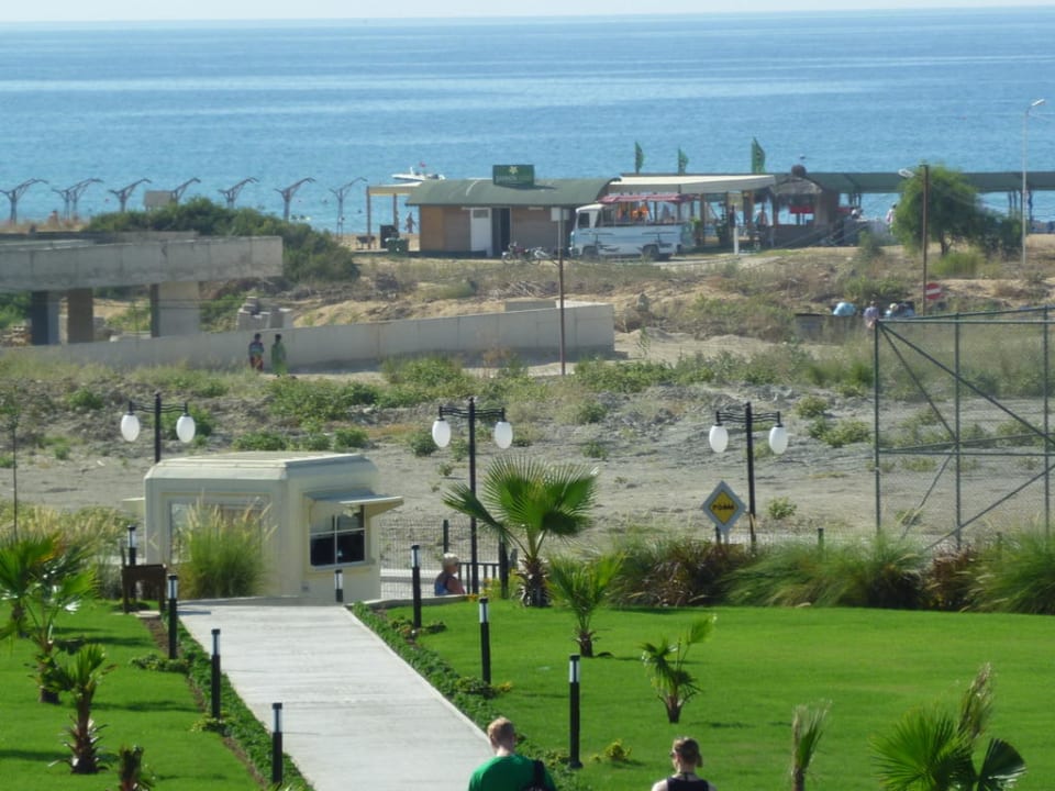 ausblick über die Gartenanlage bis zum Hotelstrand. Im Hintergrund ist die Stranbar zu erkennen.