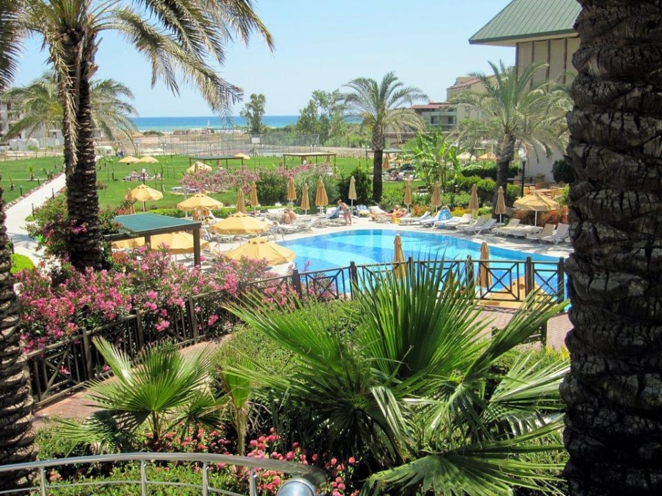 Blick von Poolbar- Treppe aus über den unteren Pool, Gartenanlage, Sportplätze bis zum Strand..