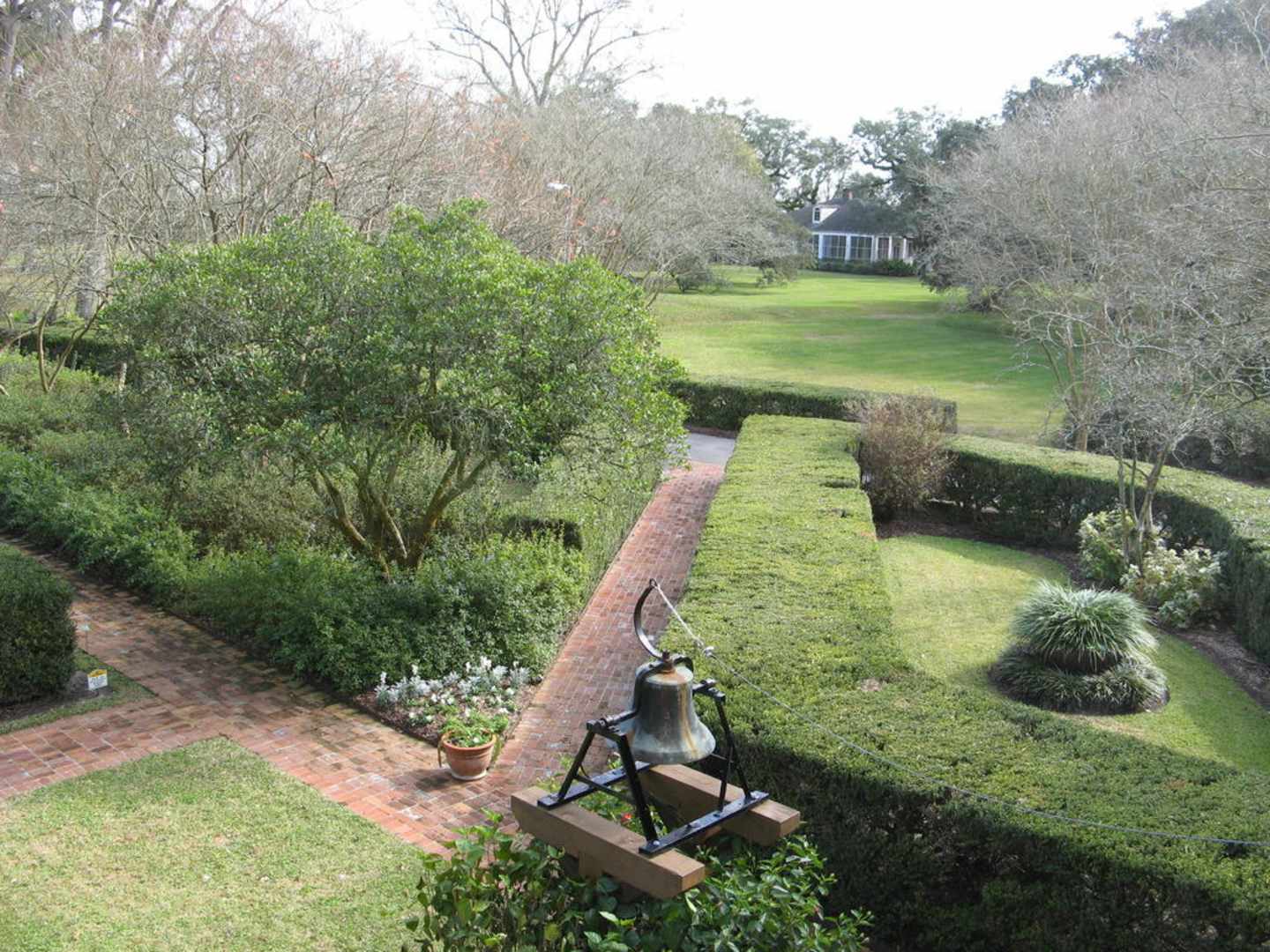 Blick vom Balkon des Platagenhauses auf die Gartenanlage