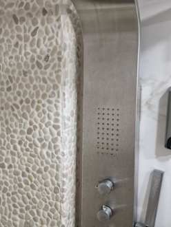 Verkalkte Dusche und Armaturen. Einmal gründlich wischen alles weg