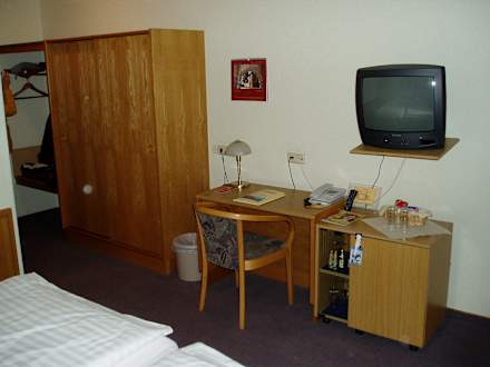 Schreibtisch mit Minibar und Kleiderschrank