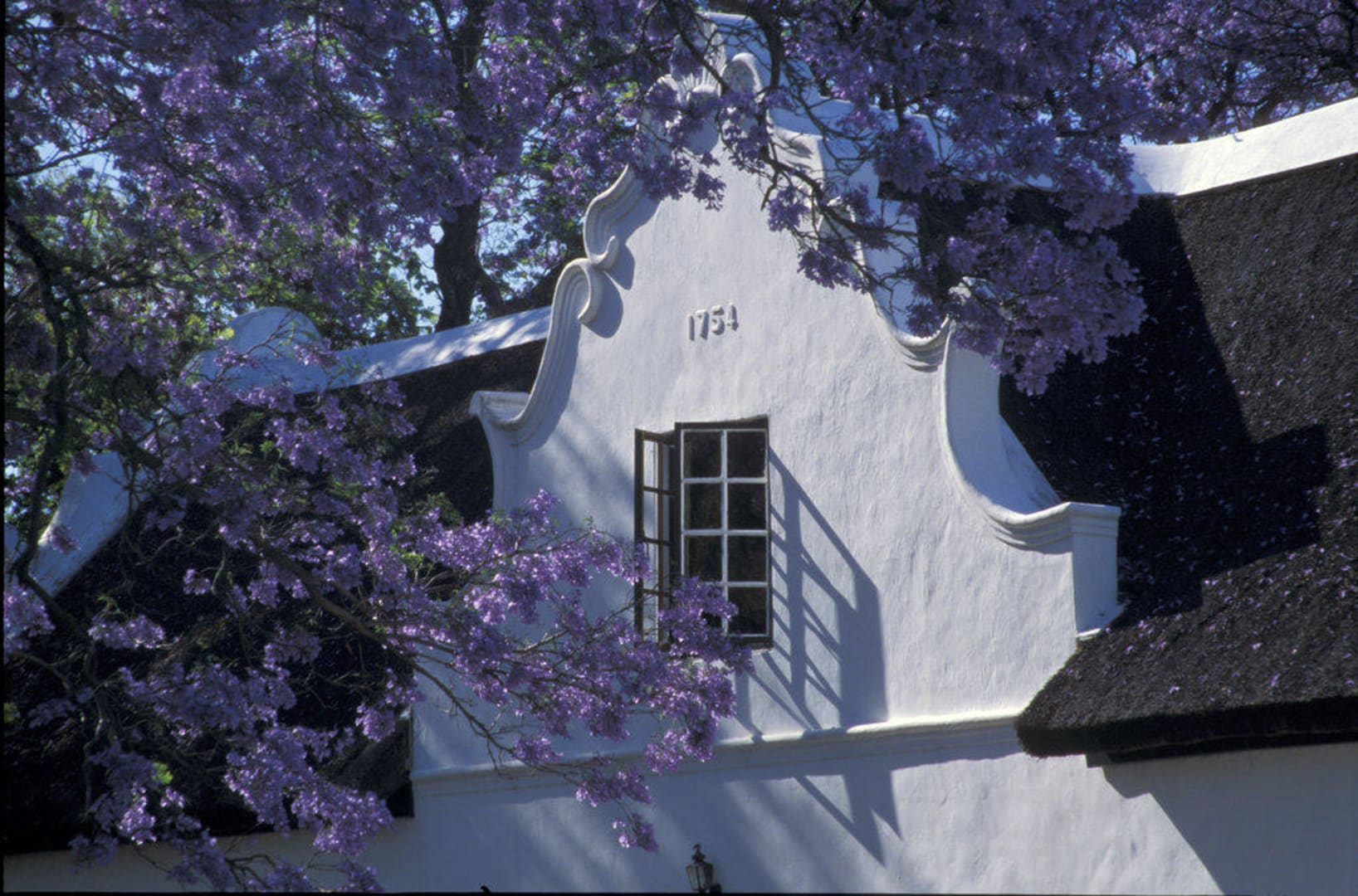 Gutshaus mit blühender Jakaranda davor