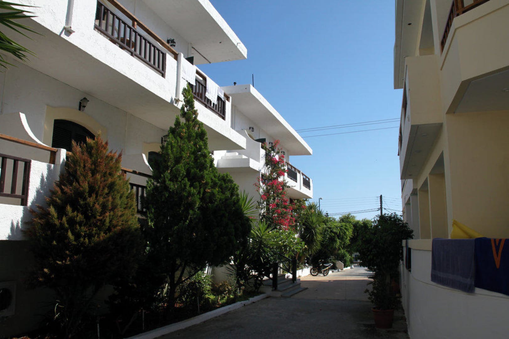Blick auf zwei der Hotelgebäude mit Blickrichtung zur Straße