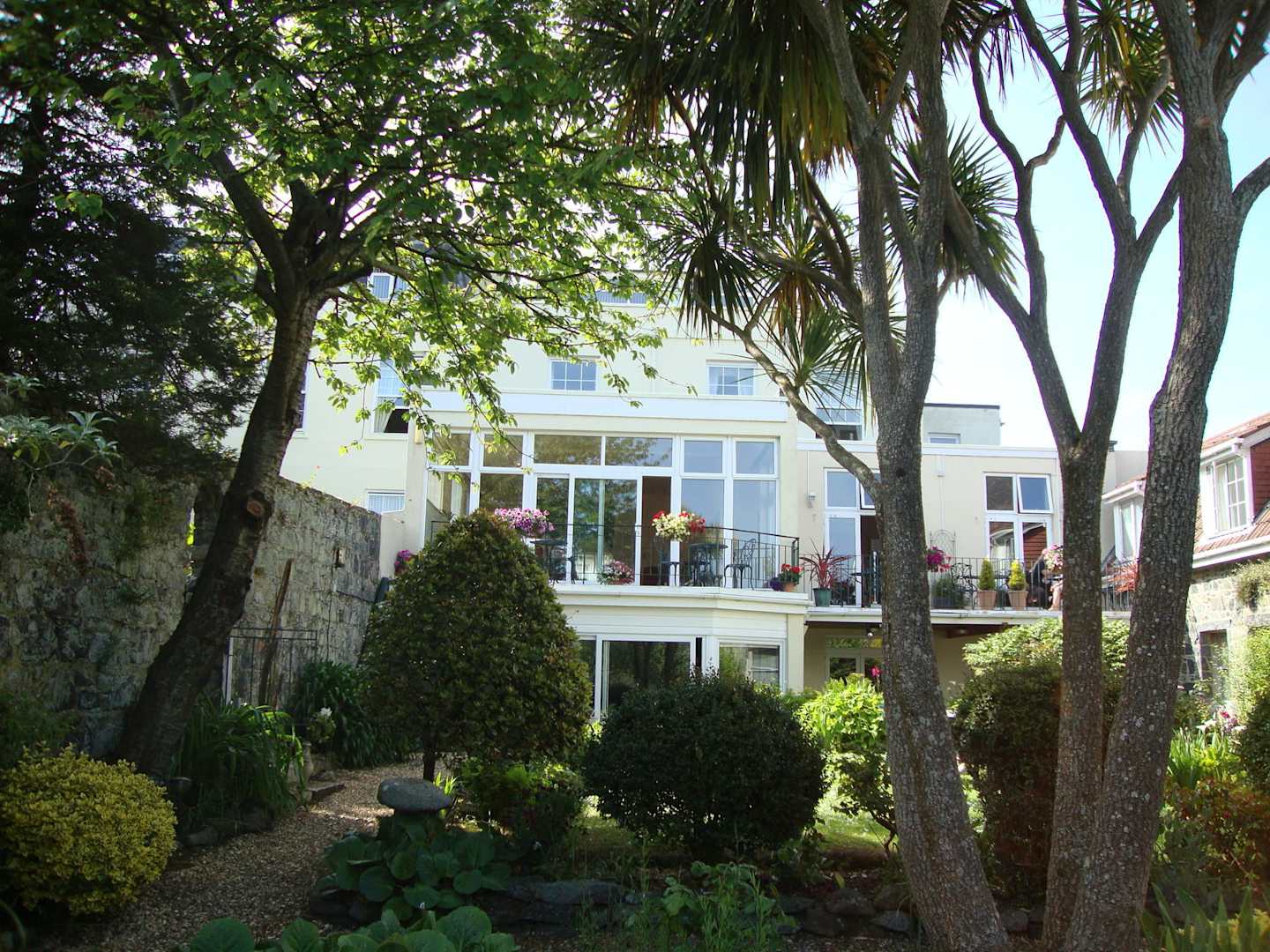 Blick vom Garten auf Hotel