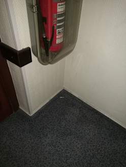 Ausgetretene Kippe auf dem Teppich im Flur, wenigstens war der Feuerlöscher gewartet