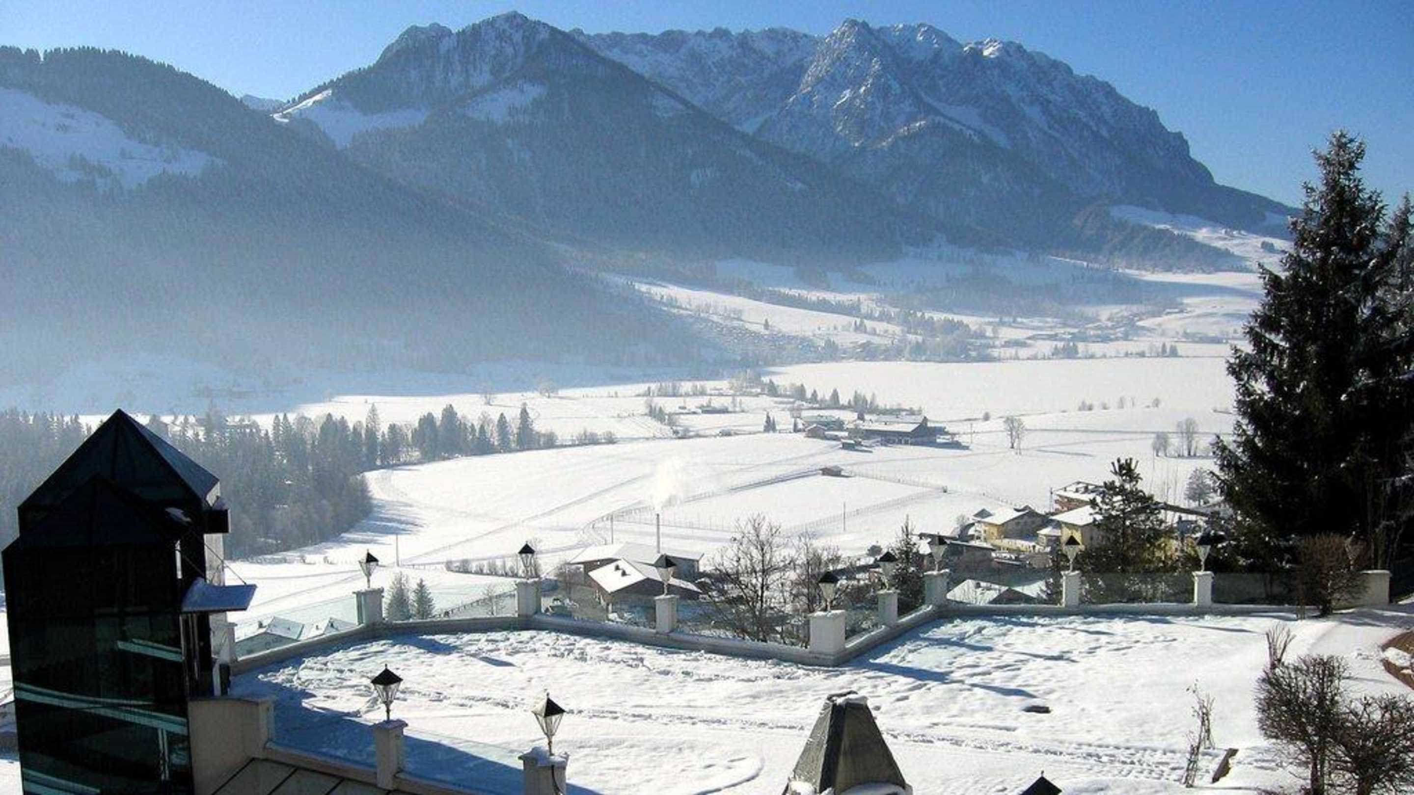 Blick aus dem Hotelzimmer auf den Wilden Kaiser und den zugefrohrenen Walchsee