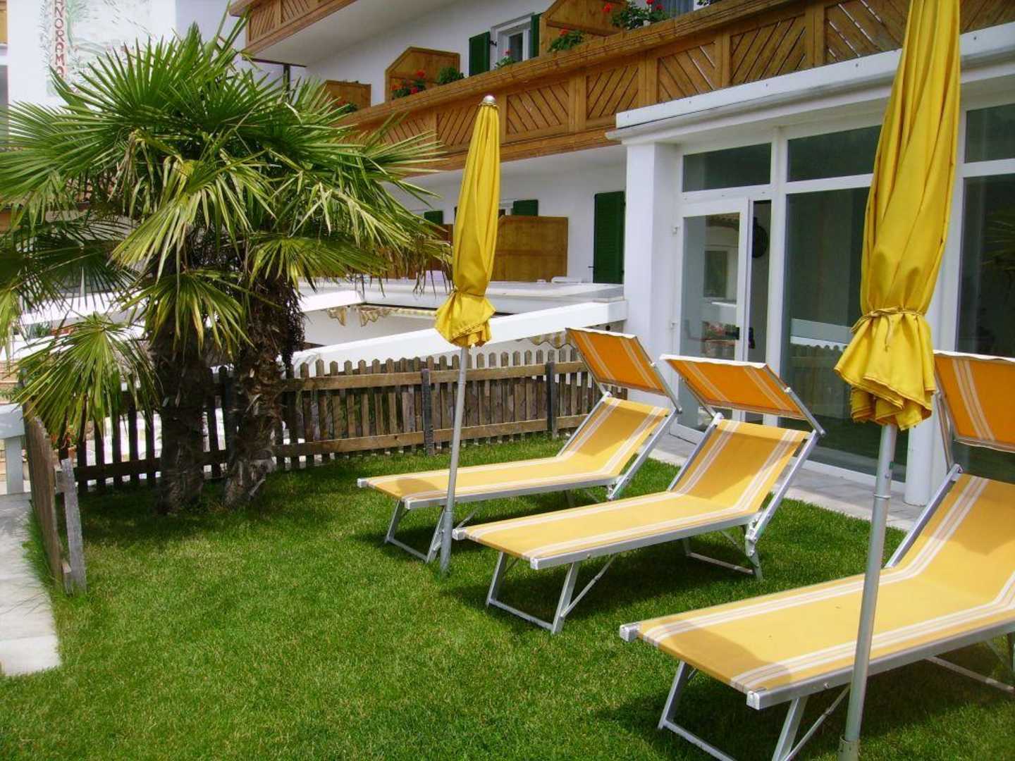 Liegewiese mit Palme und Eingang zum Pool- und Wellnessbereich