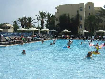 Pool und Teil vom Hauptgebäude, links die Bühne