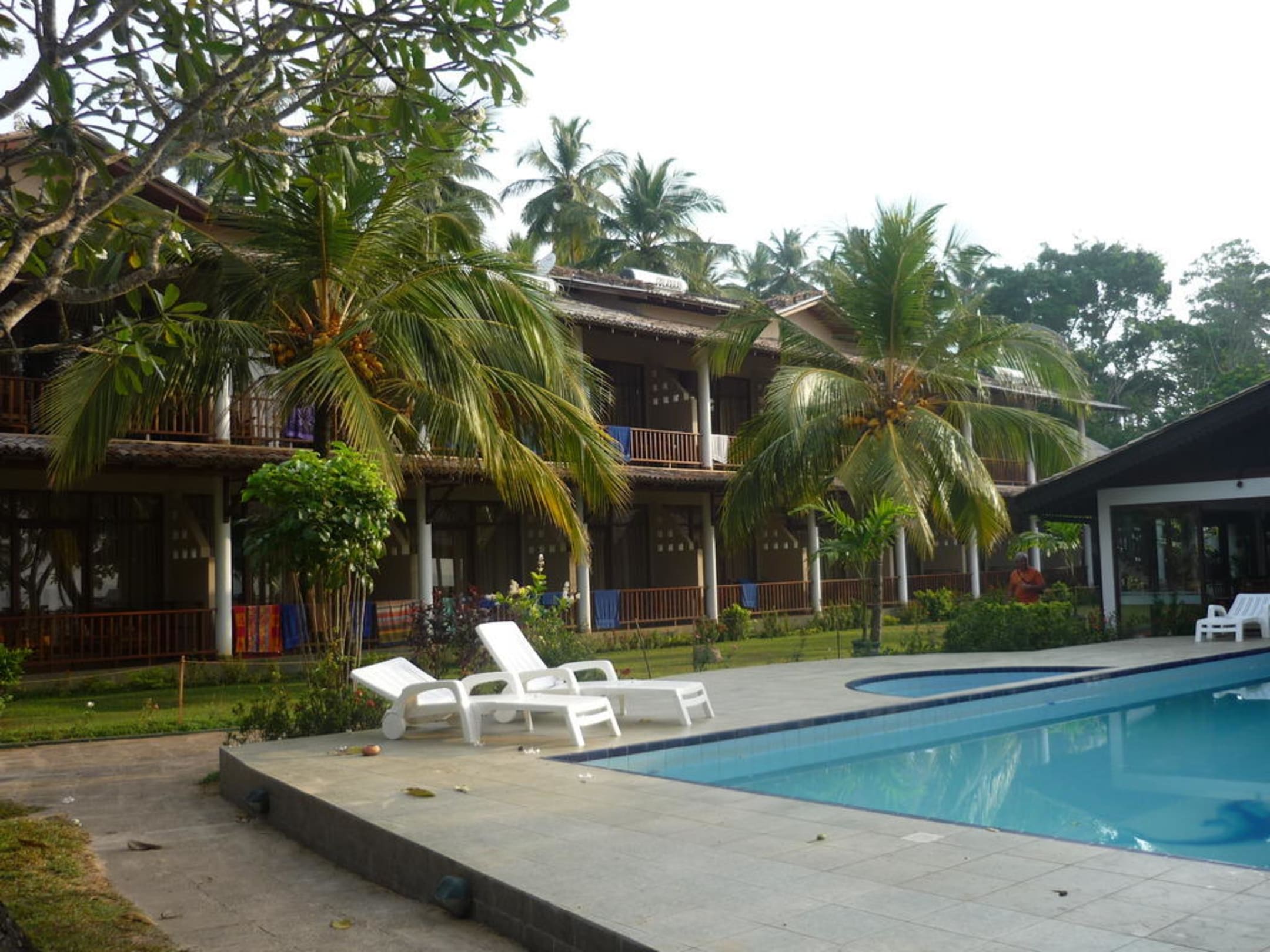 Die Zimmer im Hauptgebäude befinden sich direkt am Pool