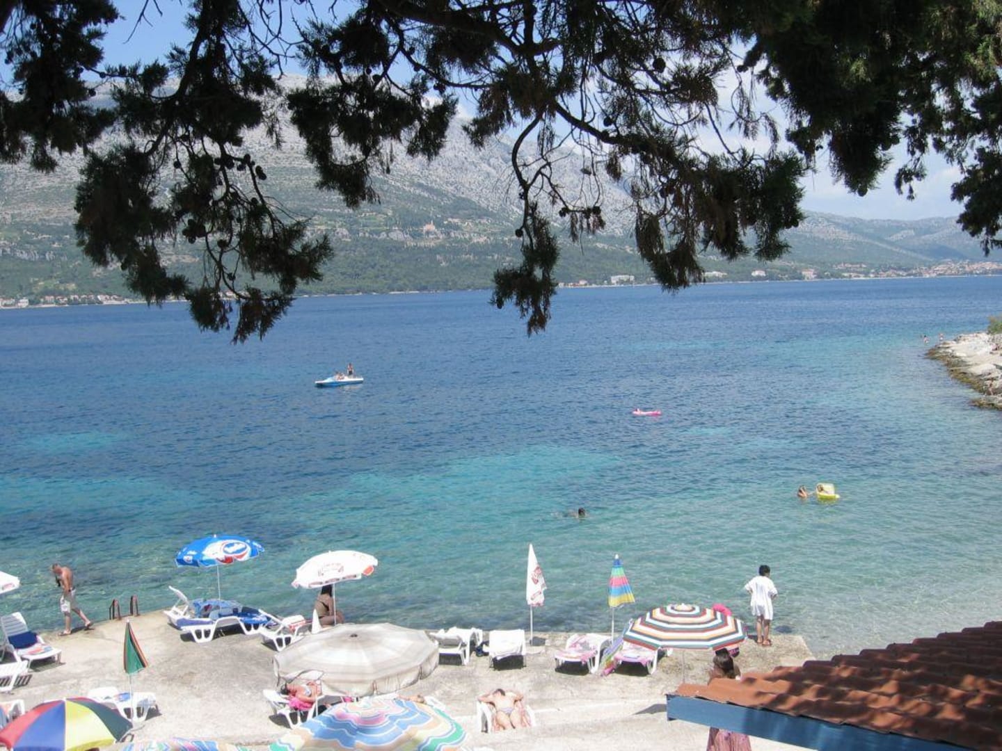 Der Blick von der Hotelterasse beim Essen. Man blickt direkt auf das Meer und den Hotelstrand. Am schönsten ist jedoch der Blick auf den Hafen und die Stadt Korcula. Leider nicht mit im Bild.