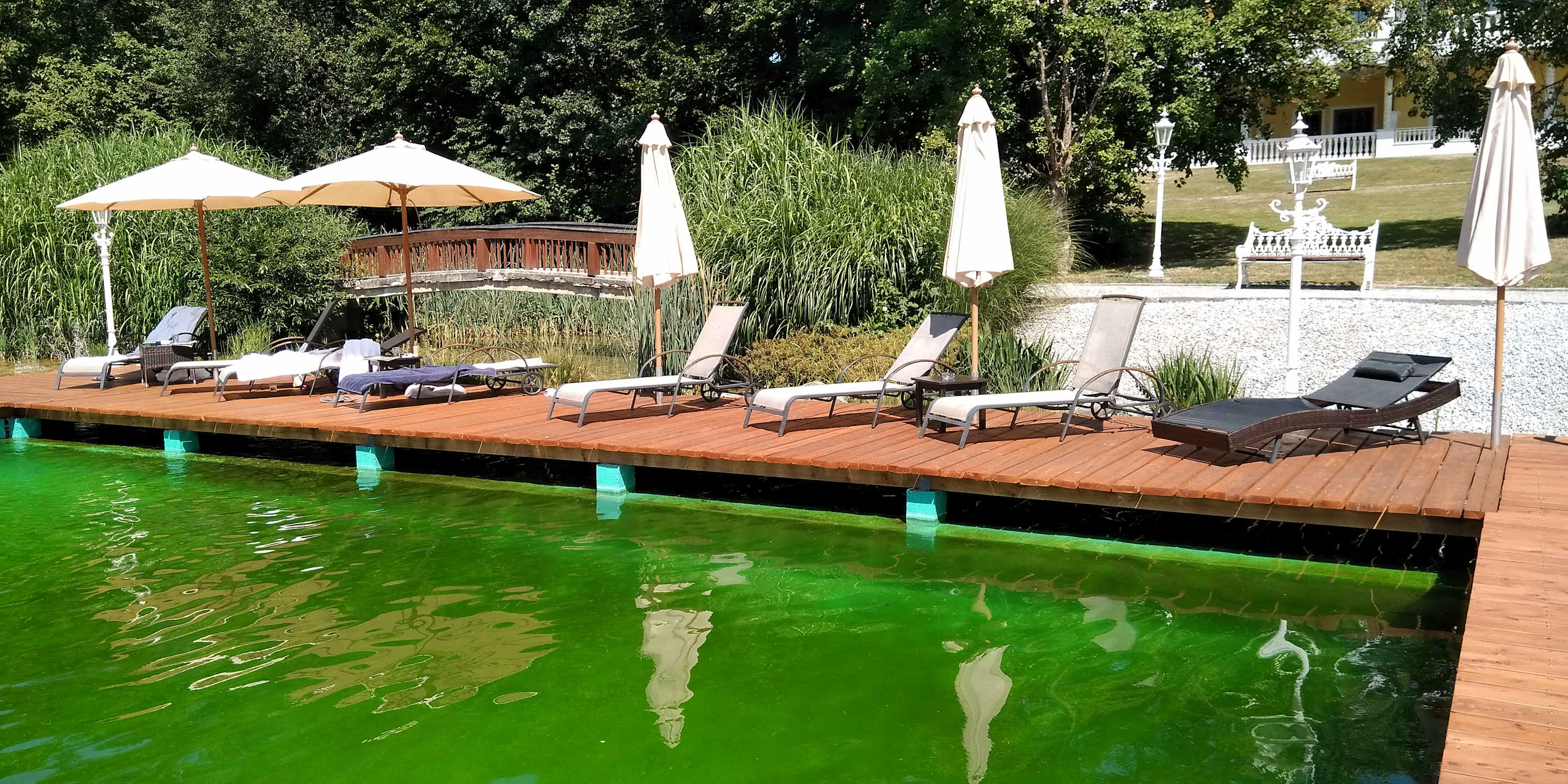 Wunderschön gestalteter Naturbade-Pool mit Holzsteg im Hotelgarten.