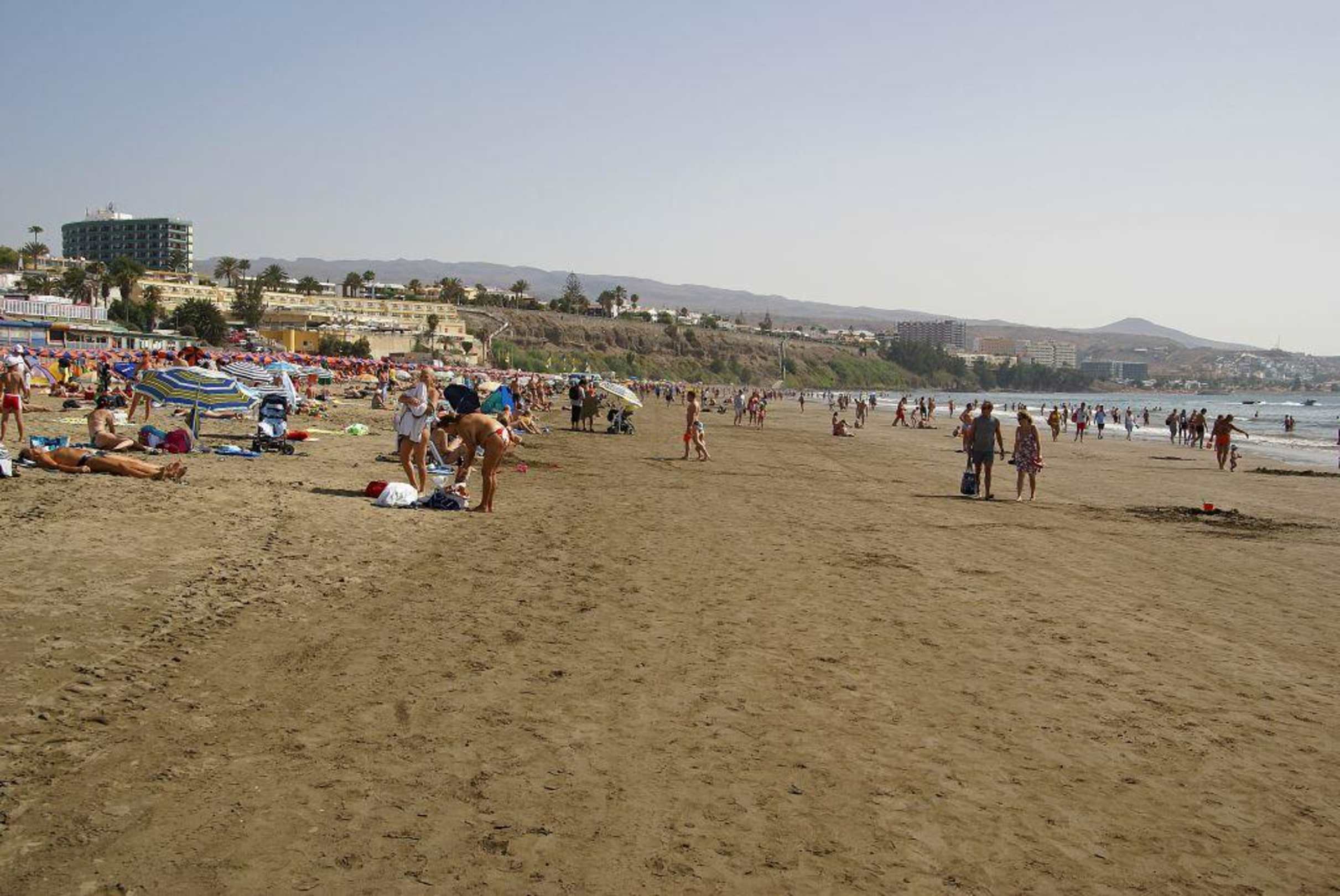 Parque TropicalDas ist der Sandstrand von Playa del Ingles und in Hintergrund wo die Bäume sind befindet sich Hotel Parque Tropical.