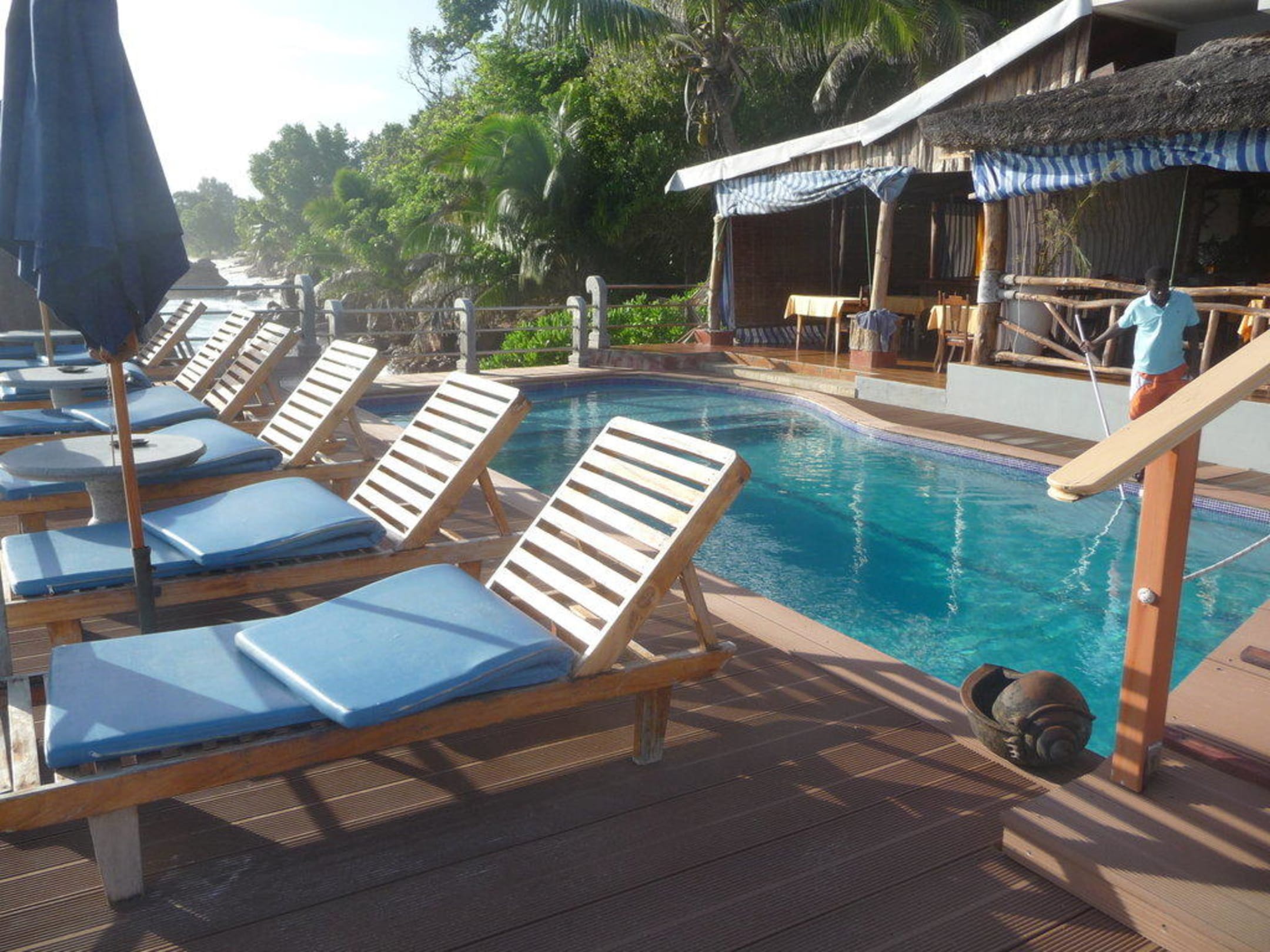 Rückseite des Hauptgebäudes mit Pool und Restaurantbereich