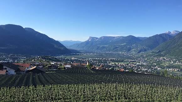 Blick von der Hotelterrasse bis zu den Dolomiten