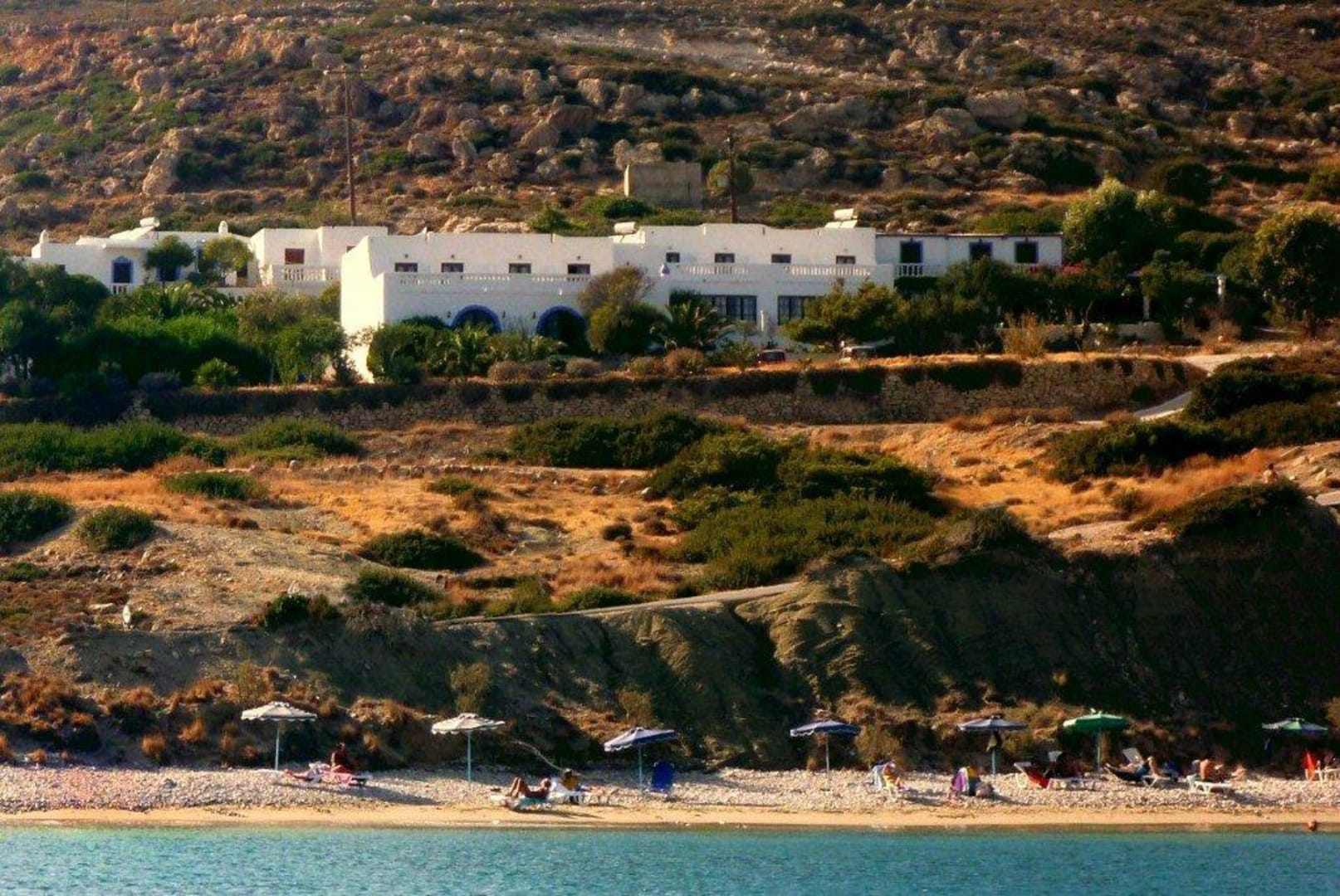 Hotel Poseidon above hotel beach with sunbeds and umbrellas