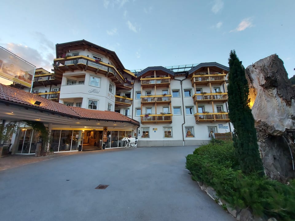 AußenansichtHotel Post, Haupteingang zum kleinen Dorfplatz. Unser Zimmer war im 2.OG, mittig in Bild (oberhalb der Kuh).