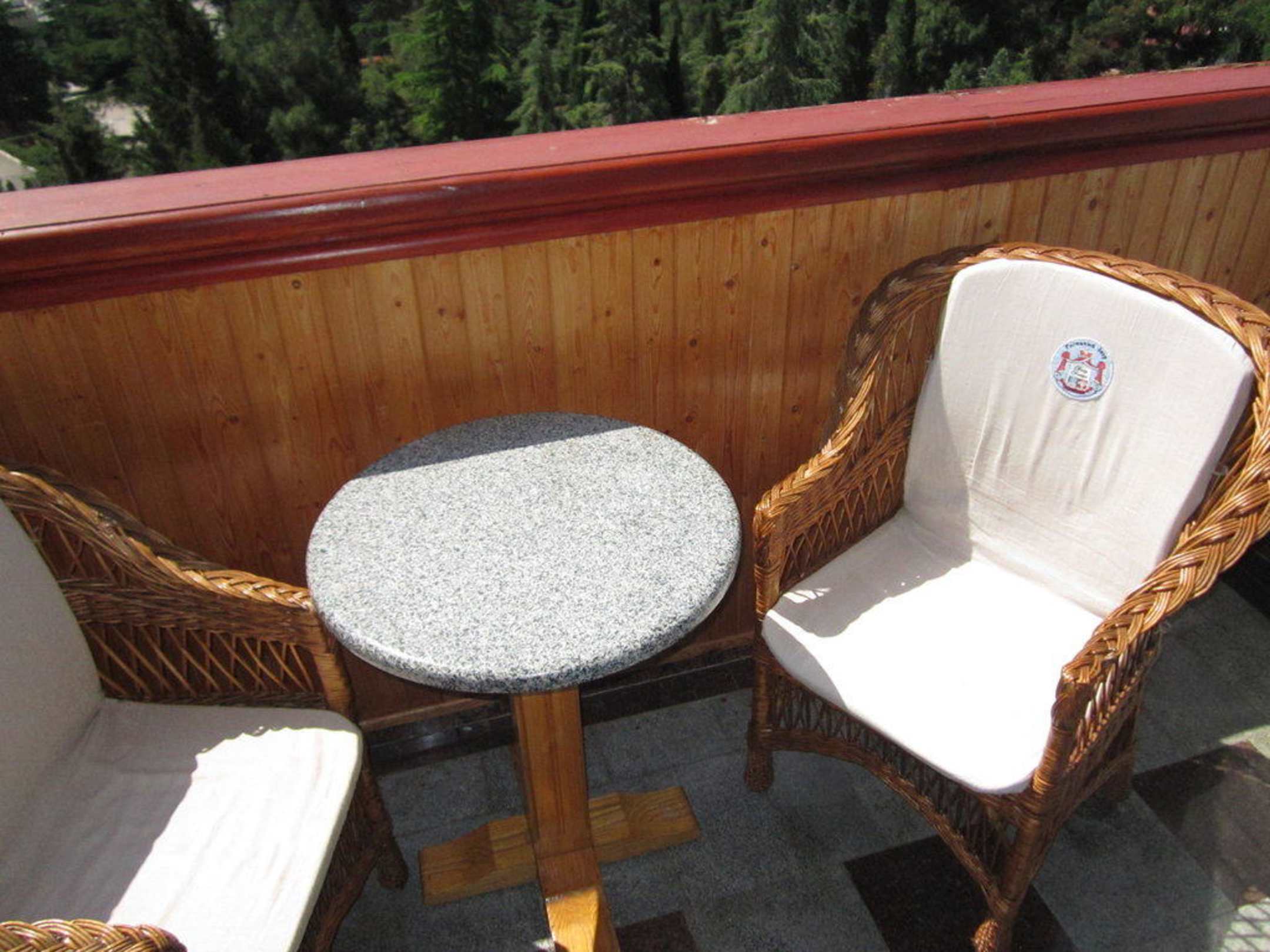 Der Balkon war mit zwei gepolsterten Korbstühlen und einem kleinen Tisch ausgestattet.