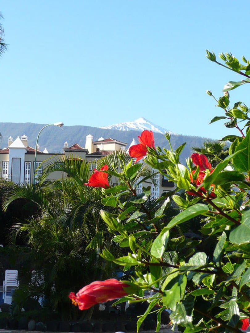 Einen herrlichen Blick hat man von der Poolanlage zum schneebedeckten Teide.