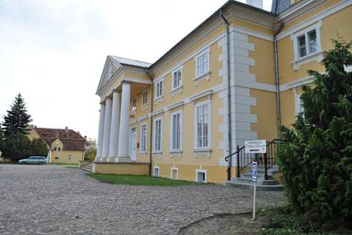 Front Pałacu z okazałymi filarami.