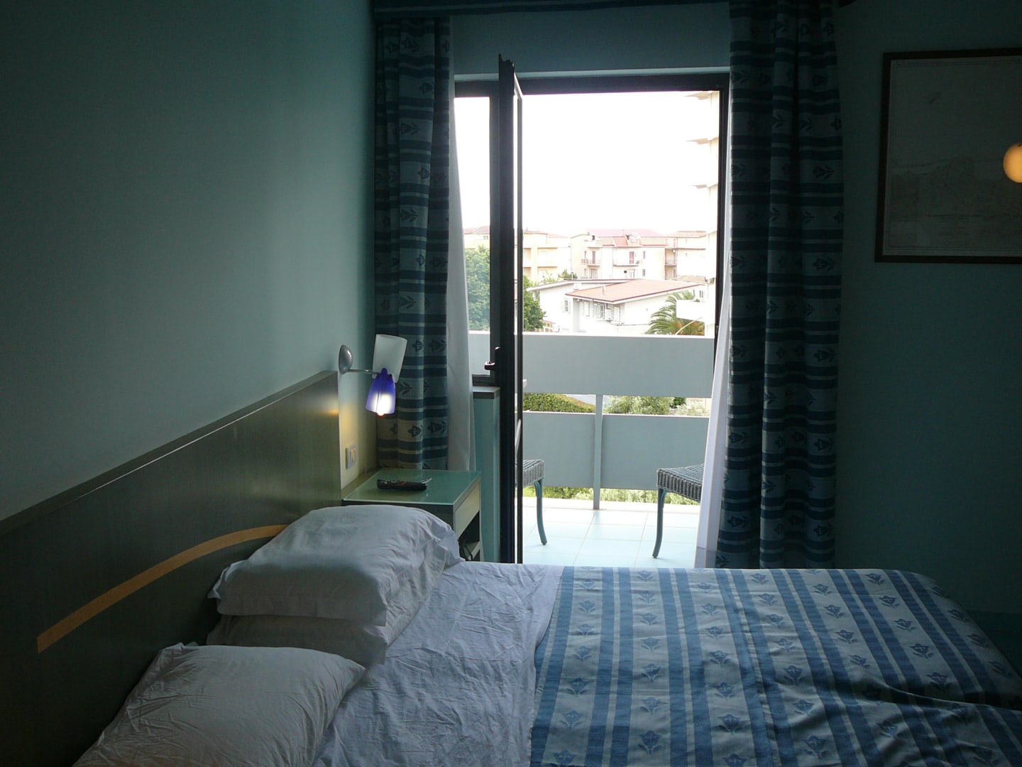 Blick über das Bett zum Balkon