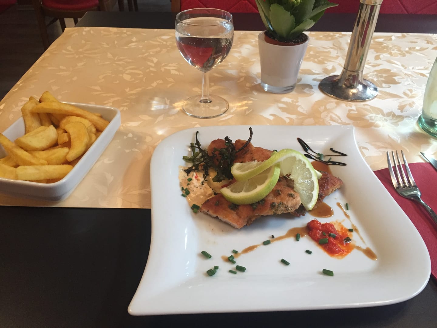RestaurantPutenschnitzel mit Rebstock Pommes. Sah sehr lecker aus und hat auch dementsprechend gut geschmeckt. Das Restaurant, kann man nur empfehlen.