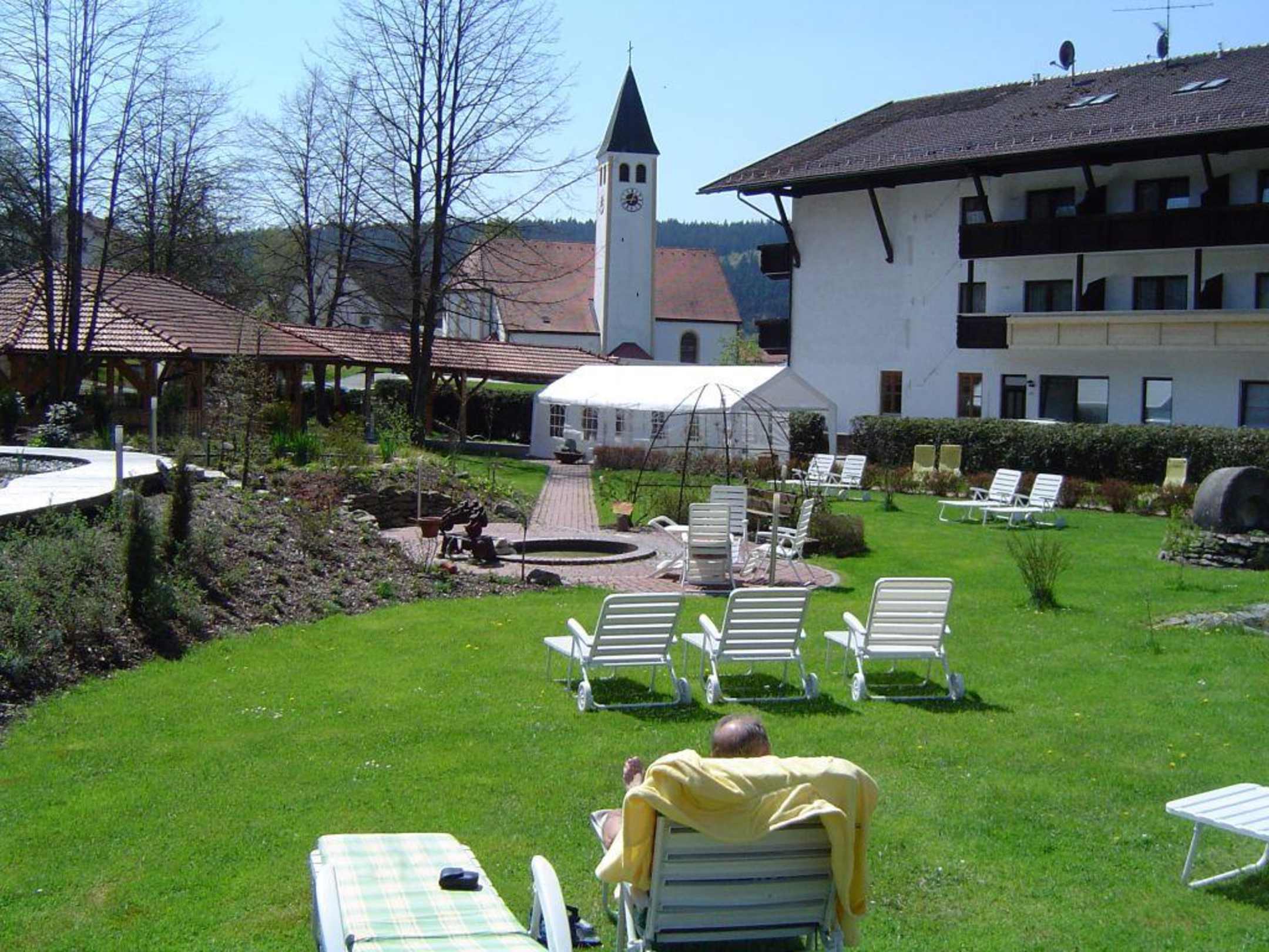 große Rasenfläche, mit bequemen Liegestühlen