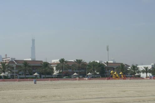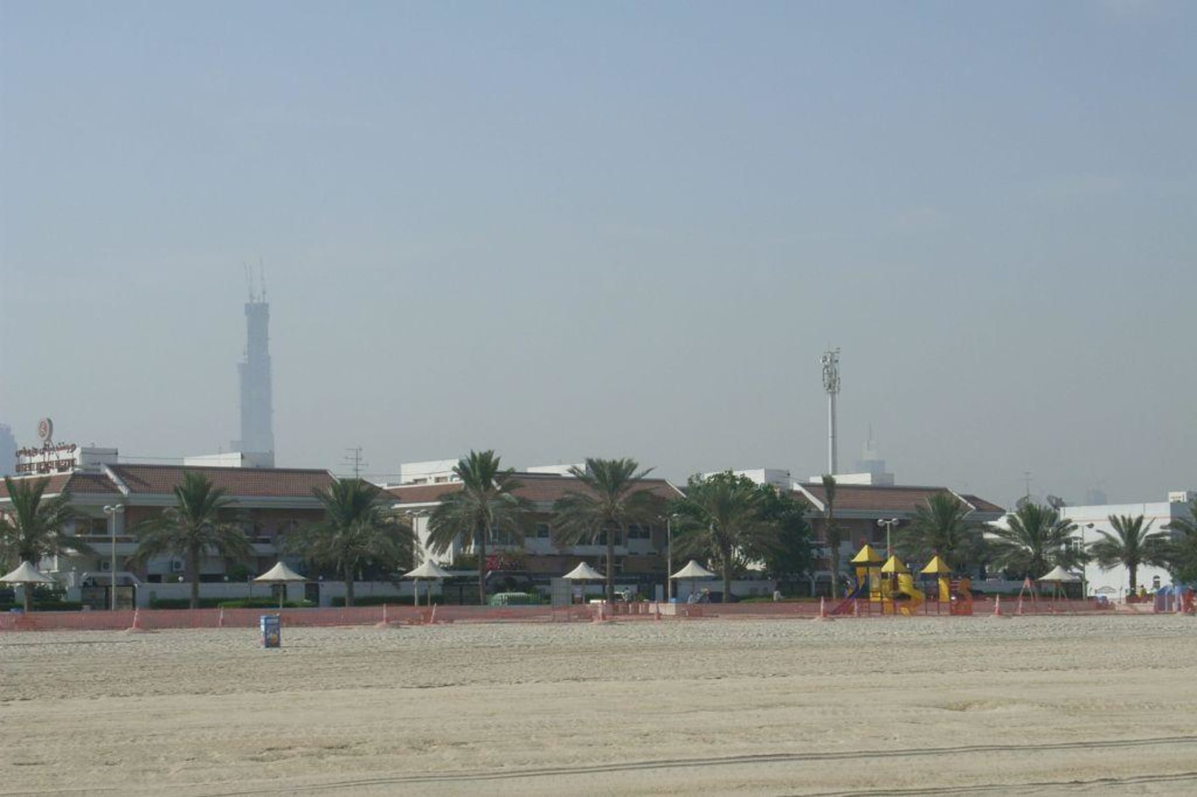 Die drei Gebäude im Vordergrund sind das Hotel Regend Beach Resort vom öffentlichen Badestrand aus gesehen. Im Hintergrund entsteht der Burj Dubai.