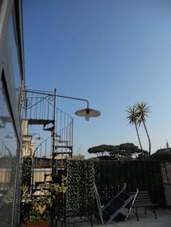 Die Terrasse befindet sich im Obergeschoss des Hotels neben dem Fitnessraum, sie ist sehr schön und man kann sich auf den vorhandenen Liegen sonnen.