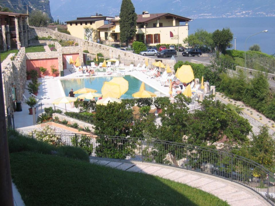 Blick vom Apartment auf den Pool. Im Hintergrund der Gardasee