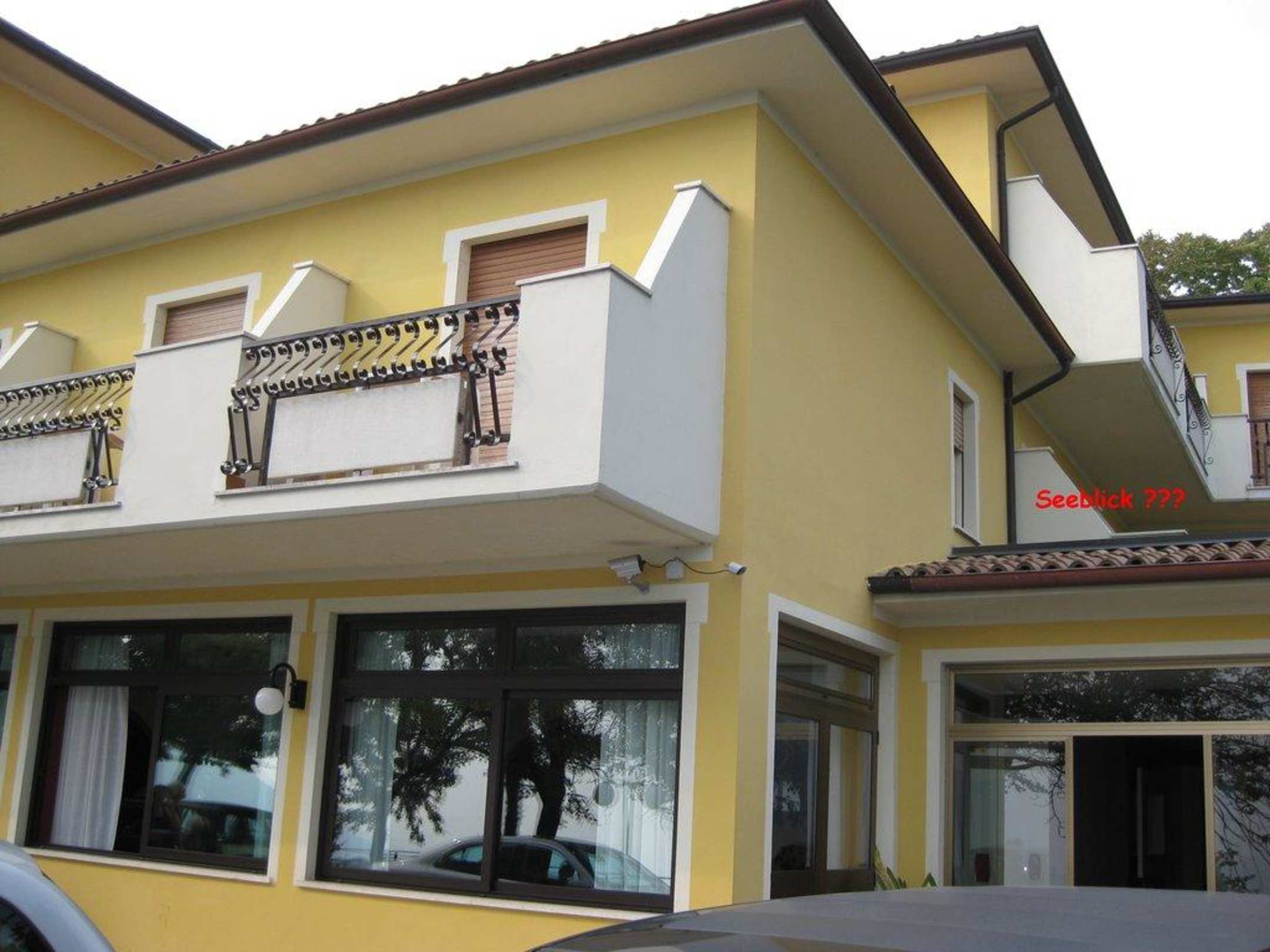 An der Frontseite sind die Zimmer mit wunderbarem Panoramablick zu sehen. Unser Zimmer lag leider um die Ecke rum. Von da mußte man den See suchen und das trotz Aufpreis "Zimmer mit Seeblick"