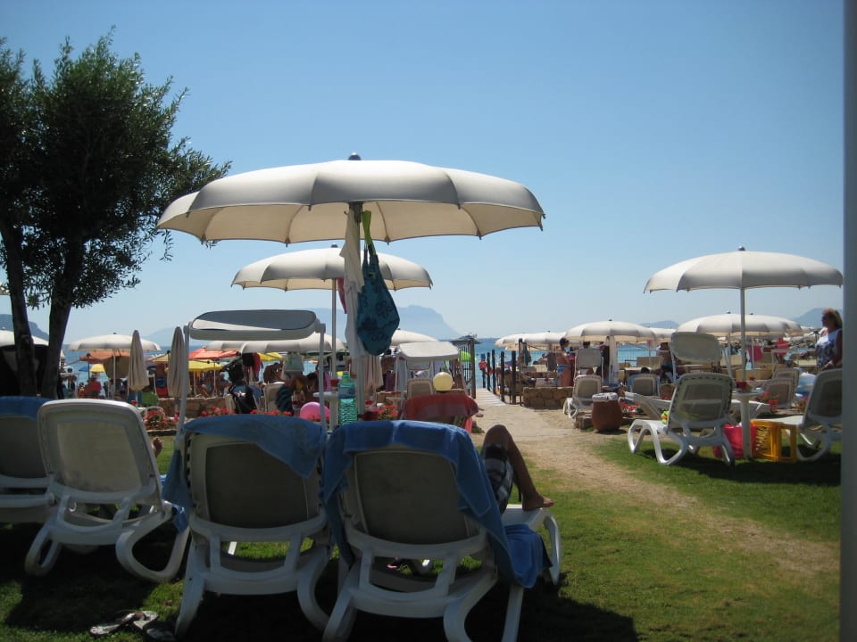Der Hauptstrand ist durch einen Zaun abgetrennt, der Weg führt durch ein Tor in diesem Zaun zum Wasser. Es gibt Liegen sowohl auf dem Rasen am Pool oder auf einem Sandteil vor dem Zaun.
