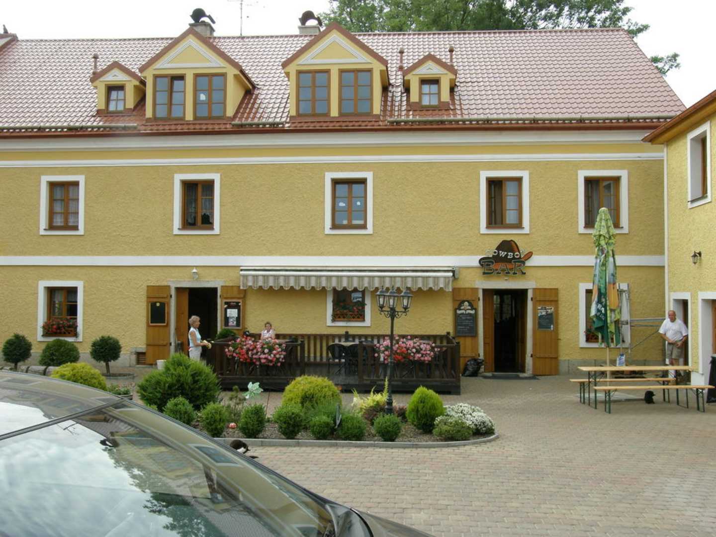 Seite des Innenhof´s mit Blick auf das Restaurant