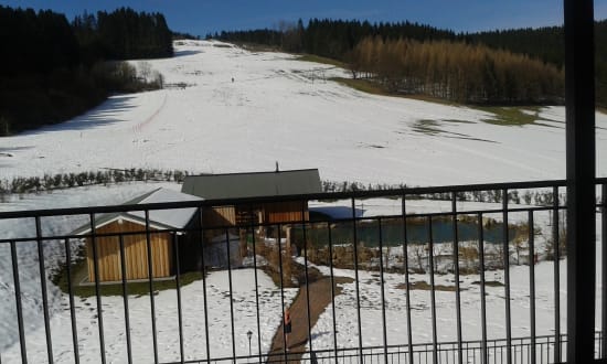 Januar 2017 Blick vom Zimmer auf die Saunalandschaft.