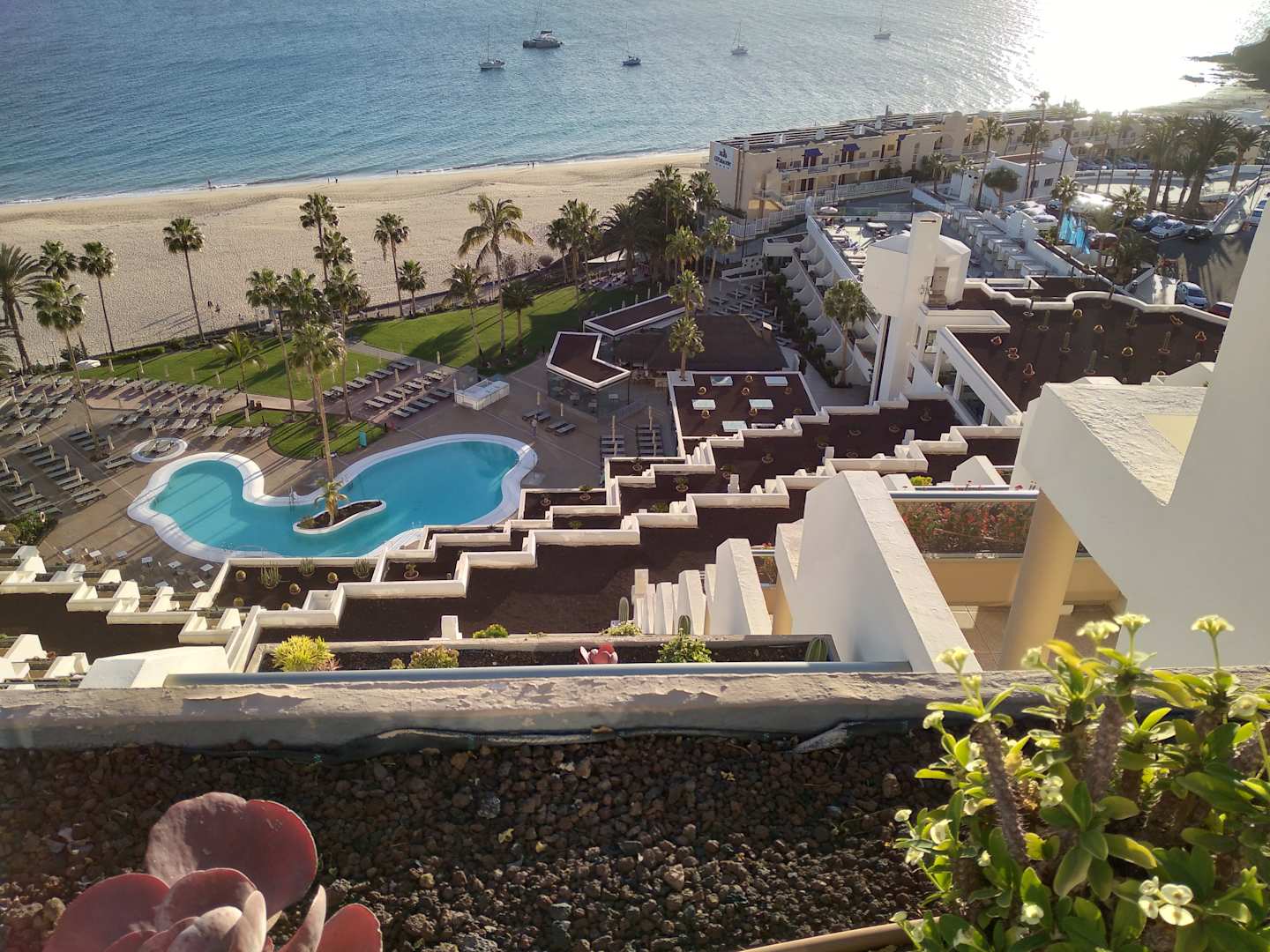 Blick von der Terrasse im 12. Stock auf Pool und Gesamtanlage