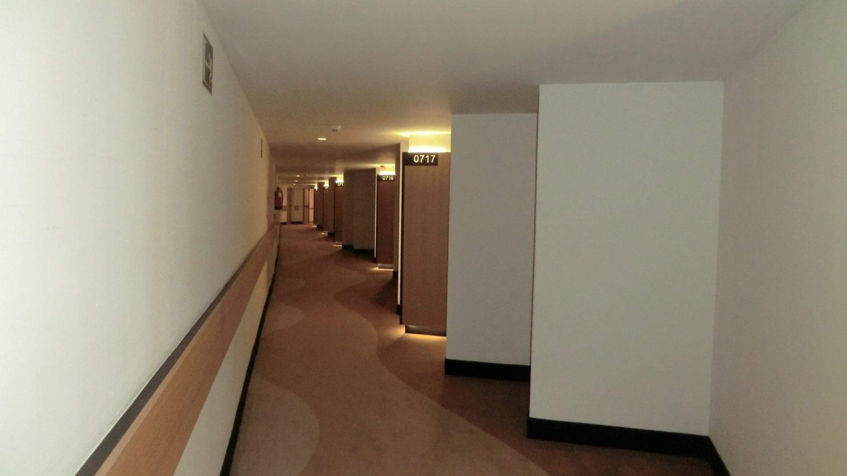 Flur zu den Zimmern. Links+rechts gibts Aufzüge