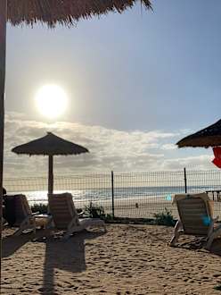 Blick auf den Strand von den Liegen des Hotels