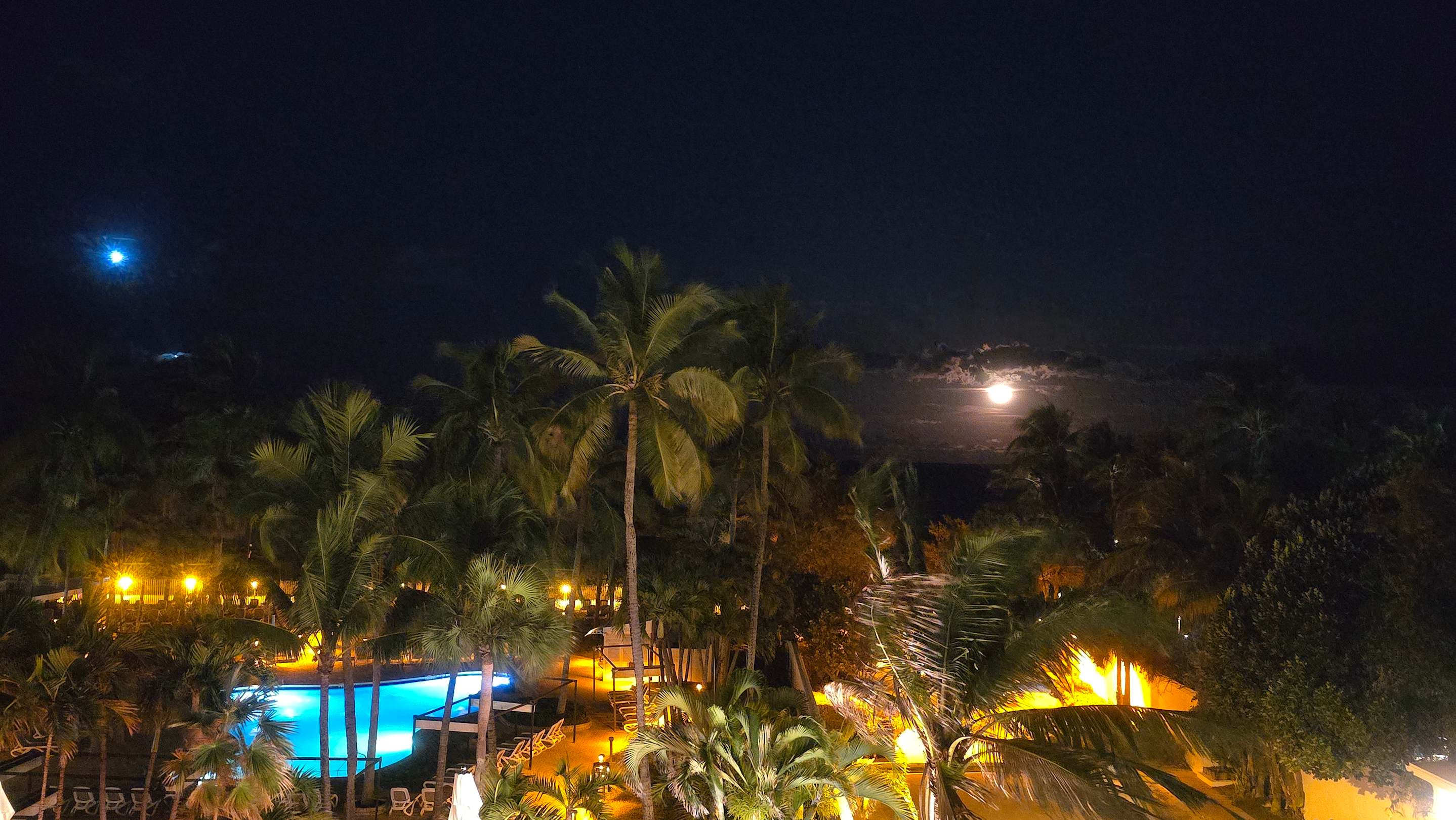 Blick auf den Pool und das Meer am Abend